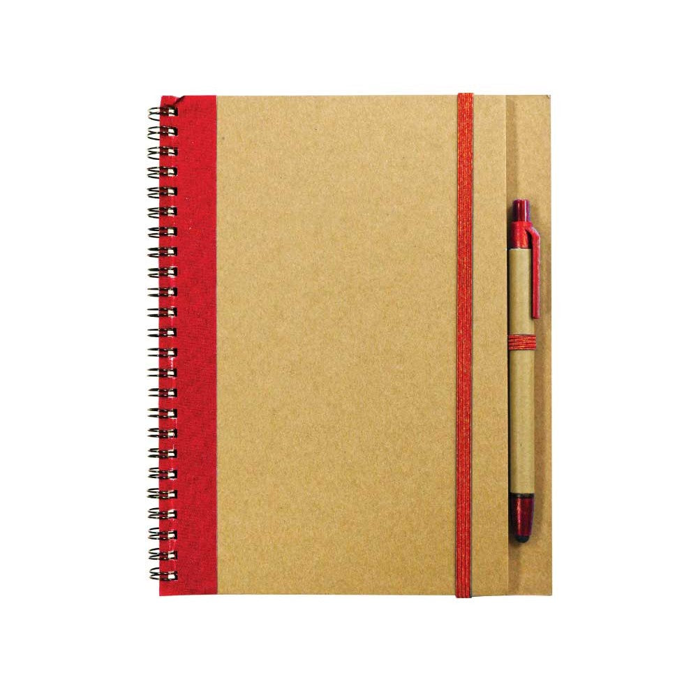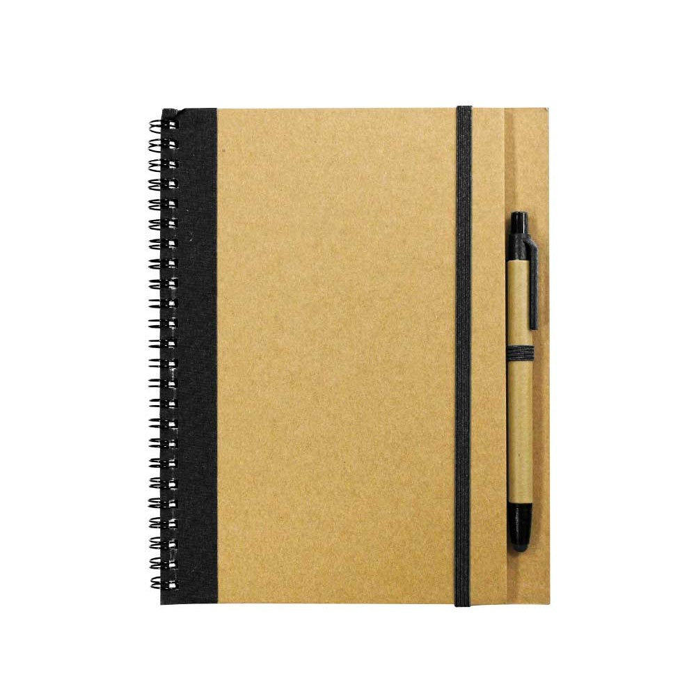 The recycled notepad with pen includes an elastic band, pen loop, and pen, which allow it to serve multiple functions such as holding pens, small items, and functioning as a notepad. Its cover is made of sturdy recycled cardboard and has a black spiral ring, as well as a colorful elastic strap and pen loop. The pen itself is also made of cardboard with a bright tip and clip, making it an excellent option for promotional items or gifts. Its small size makes it easy to pack and carry around, and it can be customized with screen printing for logos.