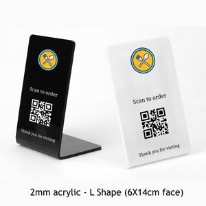 Introducing the Acrylic Menu Stand, the perfect way for restaurants to allow diners to view menus and order directly from their tables. This innovative stand is made of 2mm acrylic and is curved in an L shape for easy placement on any table. Diners can simply scan the QR to view the menu or order food and drinks. The L Shape Restaurant Menu Stand is a great way to improve the dining experience for your guests. It allows them to view menus at their own pace and order food and drinks without having to wait for a waiter or waitress. The stand is also a great way to promote your restaurant's specials and promotions. Acrylic will be Glossy, only available in Black or White material. Color matching cannot be offered in this product, color variation may occur upon printing, please avoid using pastel or unique colors for this product. Only standard CMYK colors are recommended. Requirements: VECTOR LOGO FILE & QR CODE